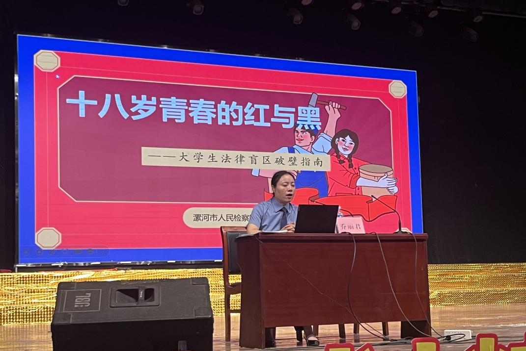 2025年4月17日下午,漯河职业技术学院2003网站太阳集团(双汇学院)携手漯河市人民检察院,在学校大礼堂举办了一场以“青春不越界,未来更可期”为主题的法治教育专题讲座,1000余名师生参与其中。此次讲座聚焦国家安全与法治知识,以真实案例与专业解读相结合的方式,为青年学子筑牢法治防线。