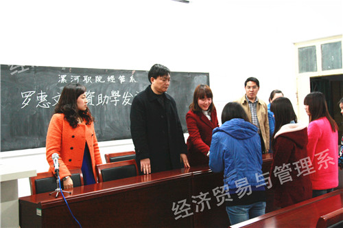 3月10日,在“罗惠文捐资助学发放仪式”上,经济贸易与管理系2011级会计电算化学生罗慧文将装有500元现金的信封分别递交到该系贫困生手中。4名贫困生满含热泪双手接过了这份沉甸甸的爱的传递。