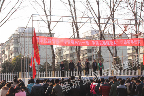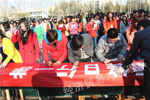 启动仪式上,全体同学在老师的带领下,在“学雷锋日行一善、争做文明经管人”横幅上签名以示决心。