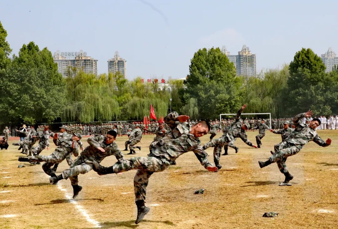 身穿迷彩服的学生带来队列动作、匕首操、格斗术、战旗出征展演,现役教官表演刺杀操,1000名新生进行心意六合拳表演,只见他们一招一式,队列整齐,动作化一,气宇轩昂,展示了出色的军事技能和新时代青年人的血性胆气。