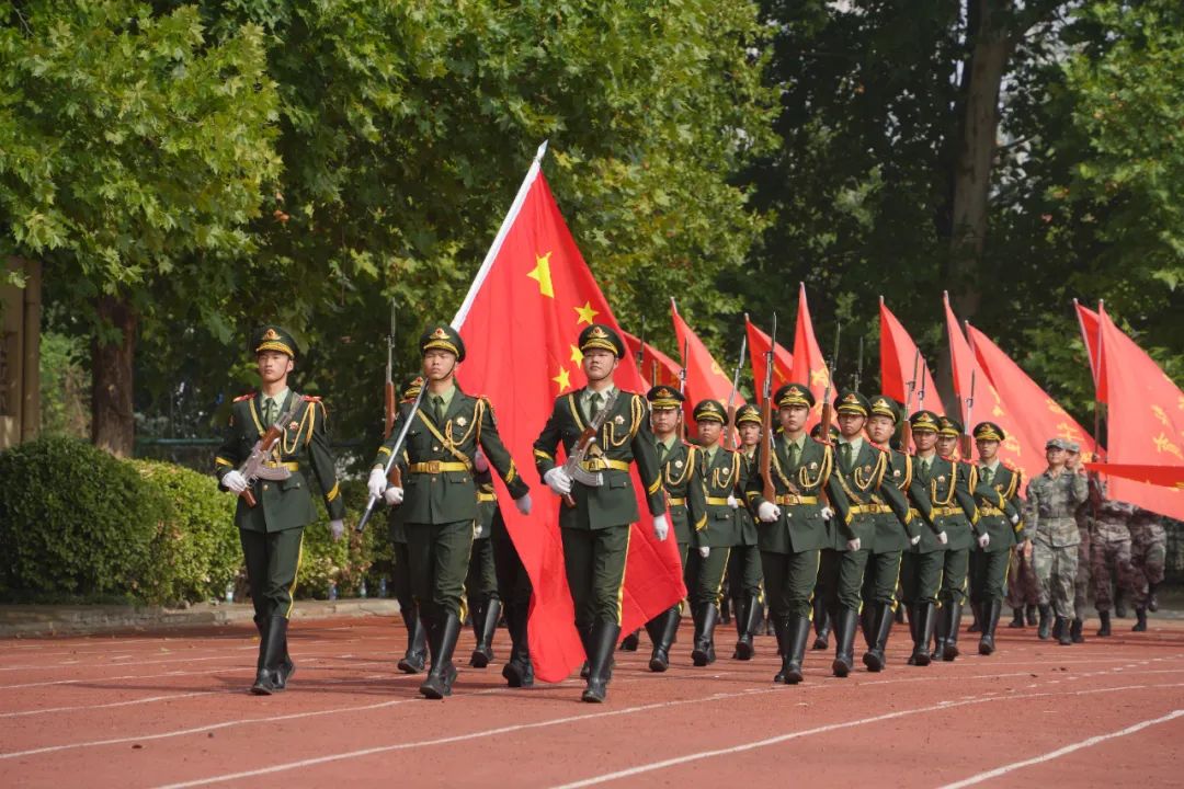 上午10时,在雄壮的国歌声中,全体师生迎着朝阳,肃立行礼,齐唱国歌,2024级新生开学典礼暨军训汇报表演正式拉开序幕。