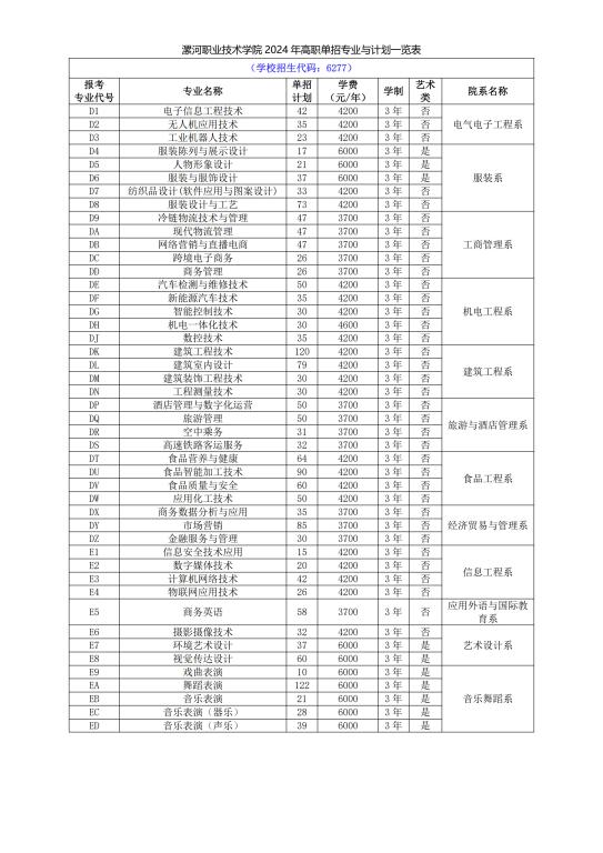 漯河职业技术学院2024年高职单招专业与计划一览表