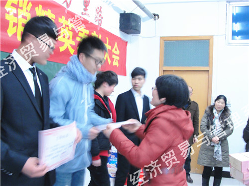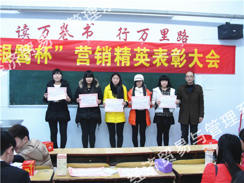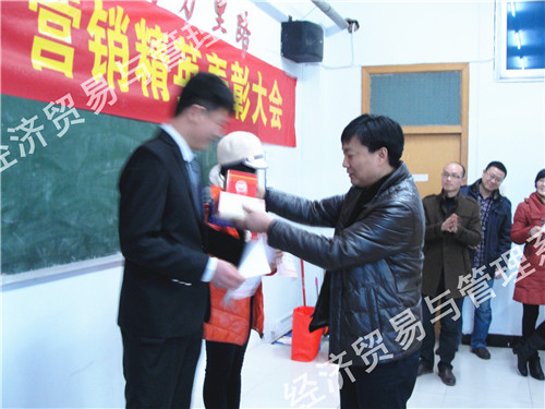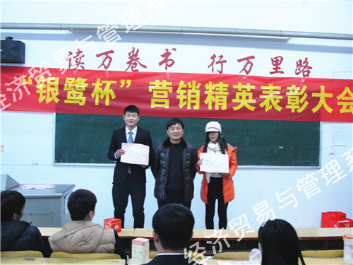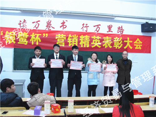 1月15日下午,经管系在1701多媒体教室召开了“银鹭杯”营销精英表彰大会。银鹭集团销售经理陈春龙、经管系领导和2014级市场专业的师生参加了大会。表彰大会由兰涛主任主持,他公布了“银鹭杯”大学生精英赛获奖学生名单,勉励大家要再接再厉,再创佳绩。他诙谐幽默的讲话,赢得大家阵阵掌声。本次比赛决出了一等奖2名、二等奖4名、三等奖6名、优胜奖8名和两个团队奖。陈春龙经理、杨惠贞主任、王珂琦主任、陈淑君教研室主任为获奖者颁发了证书和奖品。