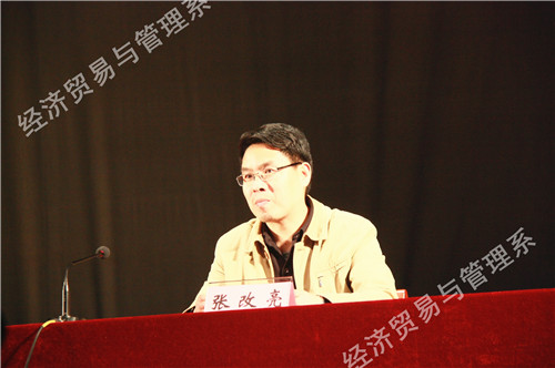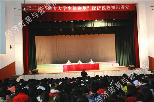 2015年4月2日,经济贸易与管理系第二届“助力大学生创业梦”经济税收知识讲座在院大礼堂举行。经管系党总支书记张改亮、企业家李慧民、国税局夏银军科长、经管系全体老师及全体在校学生参加了本次讲座。