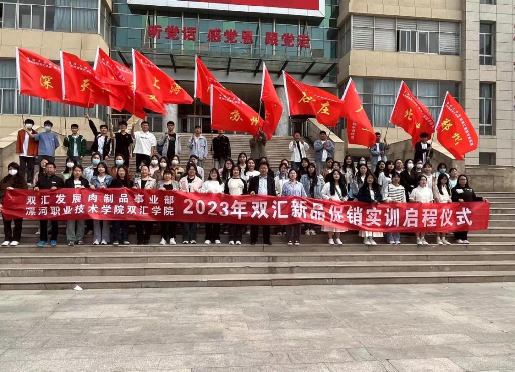 4月28日上午,随着11名学生从领导手中郑重接过“漯河工学院 漯河职业技术学院赴双汇集团专业实训”旗帜,漯河职业技术学院双汇学院81名学生,疫后首赴北京、上海等全国12个城市,为双汇集团开展2023年双汇新品促销实训活动。