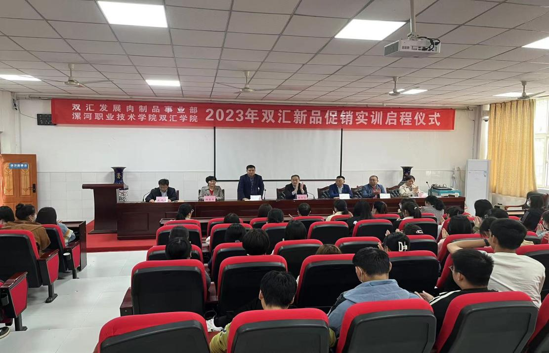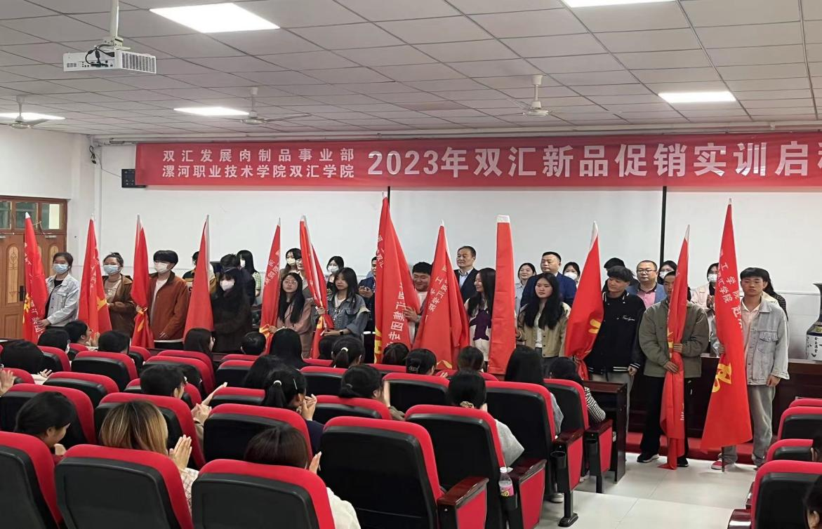 2023年双汇新品促销实训活动启程仪式由双汇发展肉制品事业部和漯河职业技术学院双汇学院共同举行。漯河职业技术学院党委副书记薛存心和双汇发展肉制品事业部销售总监赵伟波、商超部部长胡晓光等领导出席讲话并向即将实习出征学生代表授旗。