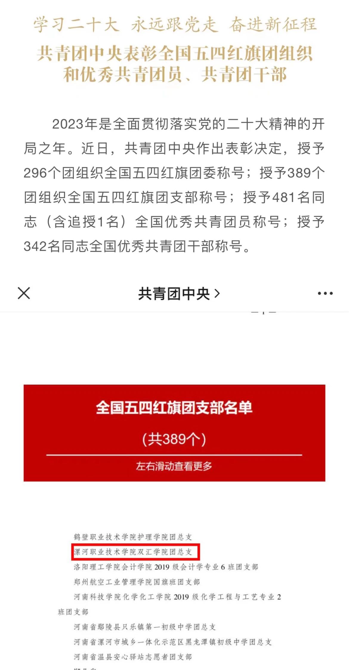 2023年是全面贯彻落实党的二十大精神的开局之年。近日,共青团中央作出表彰决定,授予296个团组织全国五四红旗团委称号;授予389个团组织全国五四红旗团支部称号;授予481名同志(含追授1名)全国优秀共青团员称号;授予342名同志全国优秀共青团干部称号。漯河职业技术学院双汇学院团总支荣获“全国五四红旗团支部”荣誉称号,这是共青团中央授予全国基层团组织的最高荣誉。