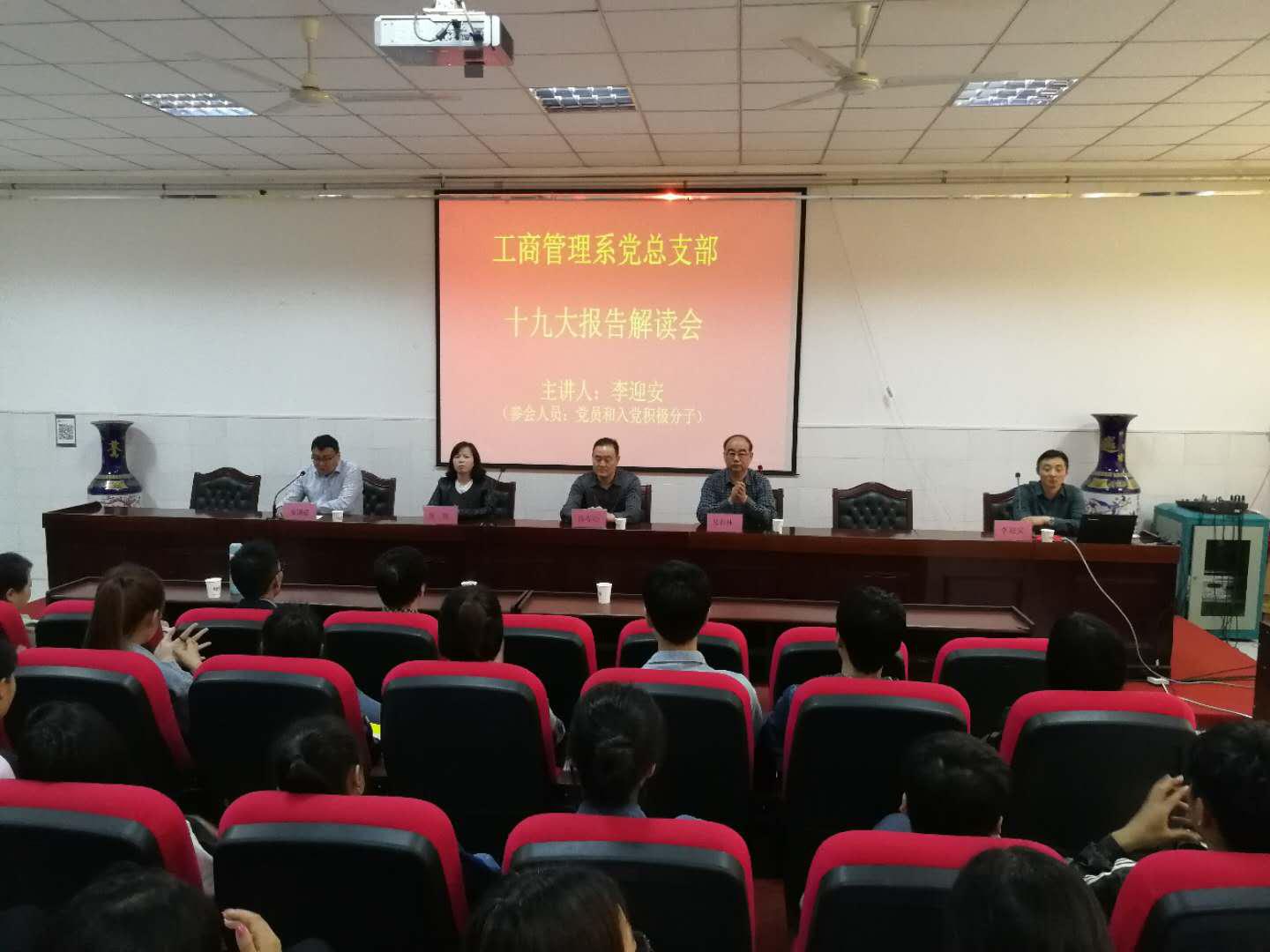 2018年4月3日下午,学院思政部副主任李迎安副教授在学院3101会议室为工商管理系党总支师生党员和入党积极分子举行了十九大报告专题解读会。学院纪委书记薛存心、党委组宣部部长易春林、学院团委书记周茜及工商管理系党总支书记安国彦出席了此次会议。