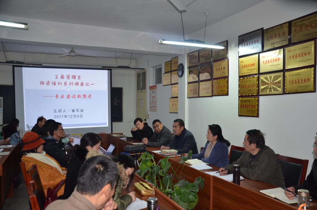 2017年12月6日,工商管理系崔军波老师为系里全体教师进行了一场题为“专业建设新思考”的专业建设学术讲座,讲座由工商管理系主任夏俊华主持。