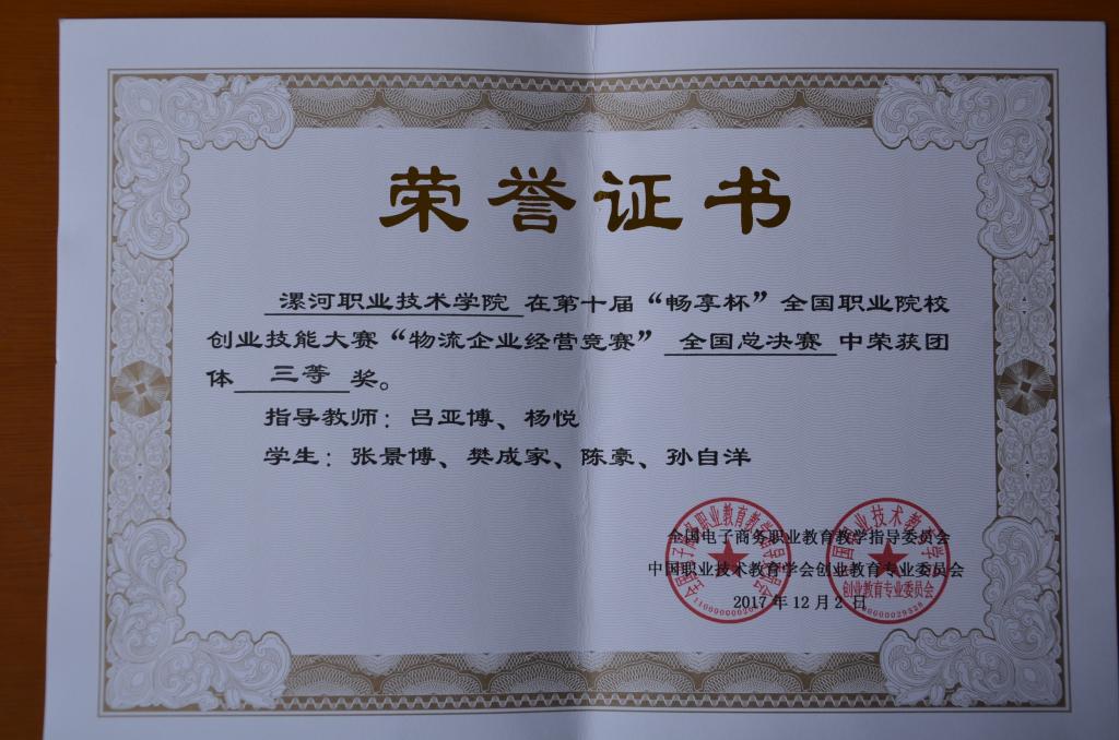 2017年12月2日,第十届“畅享杯”全国职业院校创业技能大赛暨物流企业经营技能竞赛全国总决赛在湖北武汉举行。我院工商管理系荣获团体一等奖一项,三等奖一项,再次展现了我院物流管理专业的办学实力。