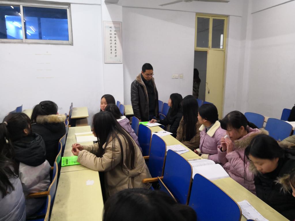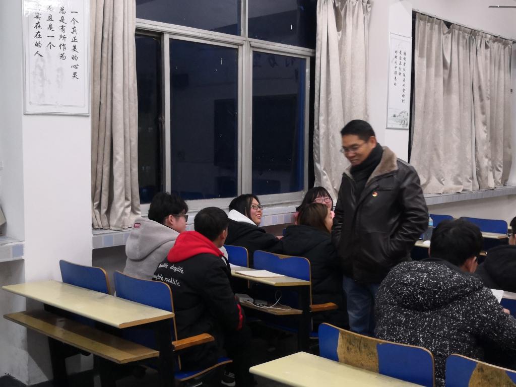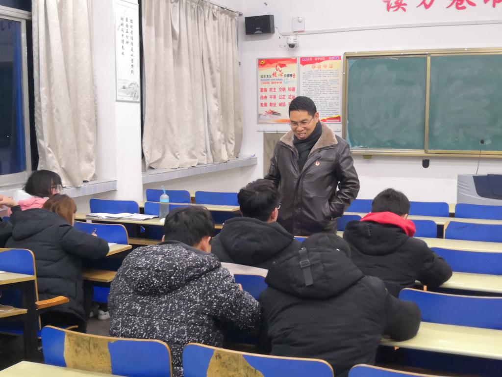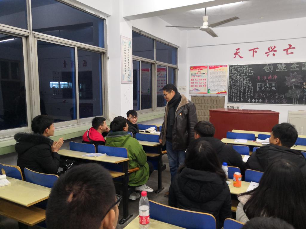 2018年12月13日晚自习,双汇学院党总支书记张改亮到自习教室抽查学生创文应知应会内容。