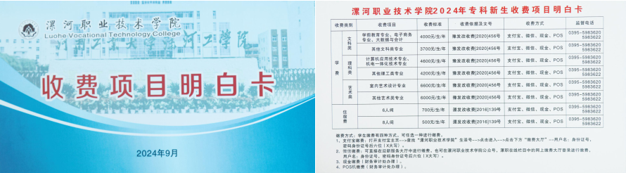 为深入贯彻落实省、市纪委监委集中整治群众身边不正之风和腐败问题部署要求以及全省教育乱收费专项整治工作推进暨秋季开学教育收费提醒告诫会会议精神,切实维护学生及其家长的合法权益,漯河职业技术学院积极推动阳光收费,严格落实教育收费公示制度,制作了载明有收费范围、项目、标准、依据、方式、监督电话等内容的专科新生“收费项目明白卡”7000余张。