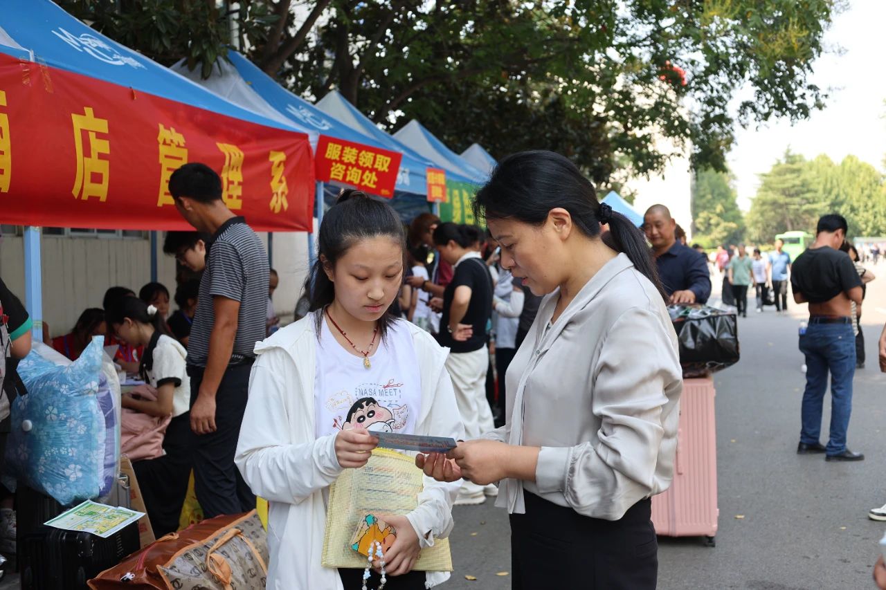 9月4日,在2024级新生报到现场,漯河职业技术学院学院院长邢淑婕与旅游与酒店管理系的一名新生亲切交流,把一张“收费项目明白卡”交到该生手中。
